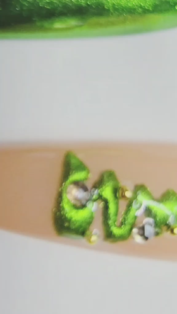 Gold glitter ombre and holiday green chrome with green chrome Christmas tree accent nail with champagne glass crystals and gold metal bead accents.